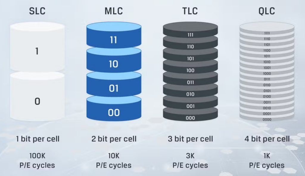 - QLC (Quad Level Cell) come suggerisce il nome i bit memorizzati diventano 4 con 16 possibili stati, da 0000, 0001, 0010….fino ad arrivare a 1111.