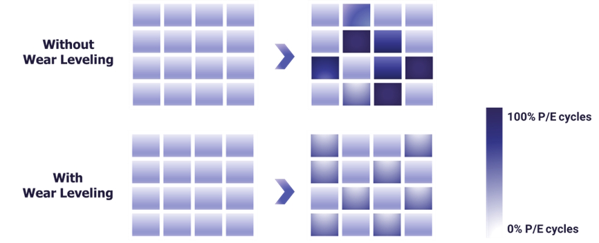 Il wear leveling è un processo che garantisce che tutte le celle del disco SSD vengano utilizzate in modo uniforme, in modo che nessuna cella si logori più velocemente di un’altra. Questo meccanismo funziona tenendo traccia del numero di volte in cui ogni cella è stata scritta o cancellata, e spostando i dati per bilanciare l’utilizzo delle celle. […] In questo modo, il disco SSD può prolungare la propria durata evitando punti critici e distribuendo l’usura in modo uniforme sulla memoria flash.