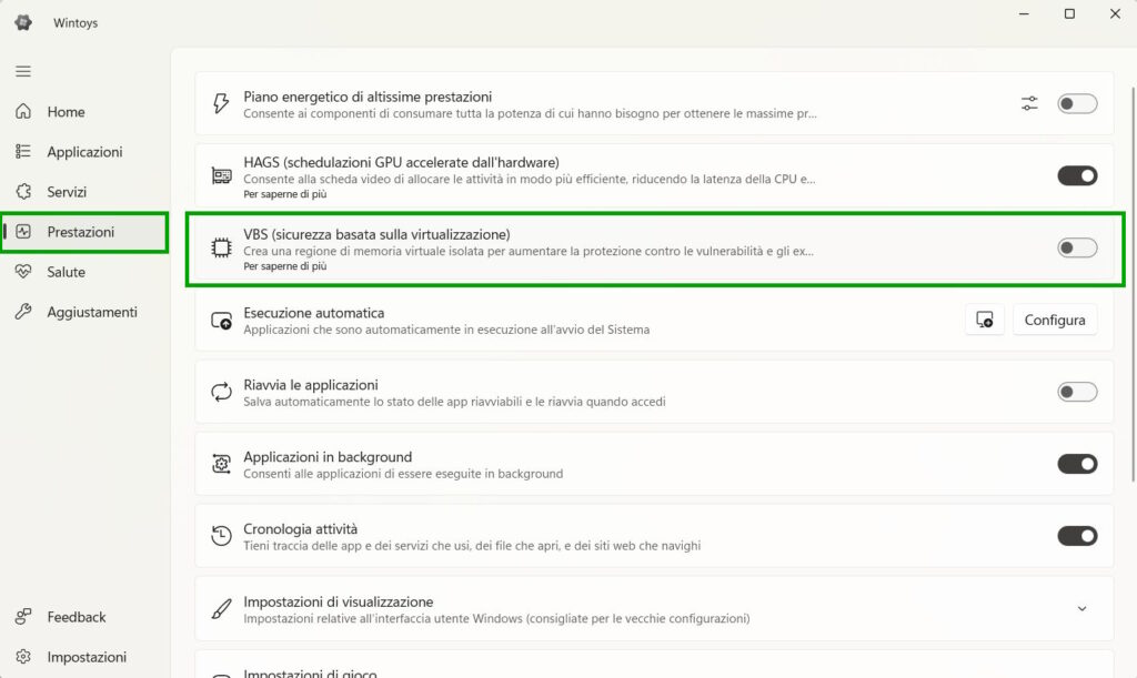 Grazie a Wintoys, ho potuto spiegare alla cliente come risolvere la lentezza delle macchine virtuali in pochi secondi, senza scendere troppo in tecnicismi. È bastato avviare il programma, andare alla voce Prestazioni e disattivare la voce VBS (come mostrato nello screenshot qui sotto).
