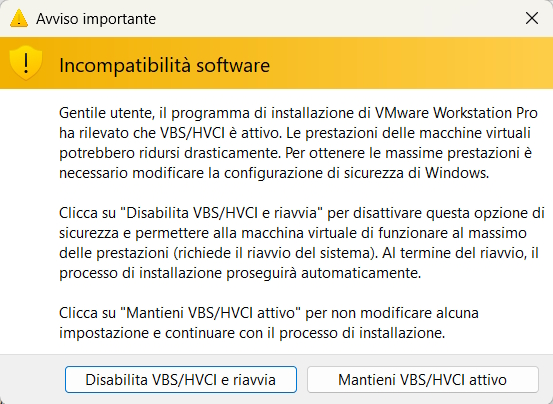 - Non esiste un “lasciapassare” magico. Non c’è modo di autorizzare VMware come applicazione “fidata” per avere accesso diretto alla CPU mantenendo attive le sicurezze di Windows 11. Non è una questione di permessi o firme digitali, ma di architettura: quando VBS è attivo, l’hypervisor di Microsoft si posiziona fisicamente tra il software e l’hardware. Nemmeno il kernel di Windows ha più il controllo diretto. Per ridare a VMware l’accesso nativo, l’unica via è disattivare lo strato di virtualizzazione di Microsoft, accettando il compromesso di ridurre alcune difese del sistema operativo.